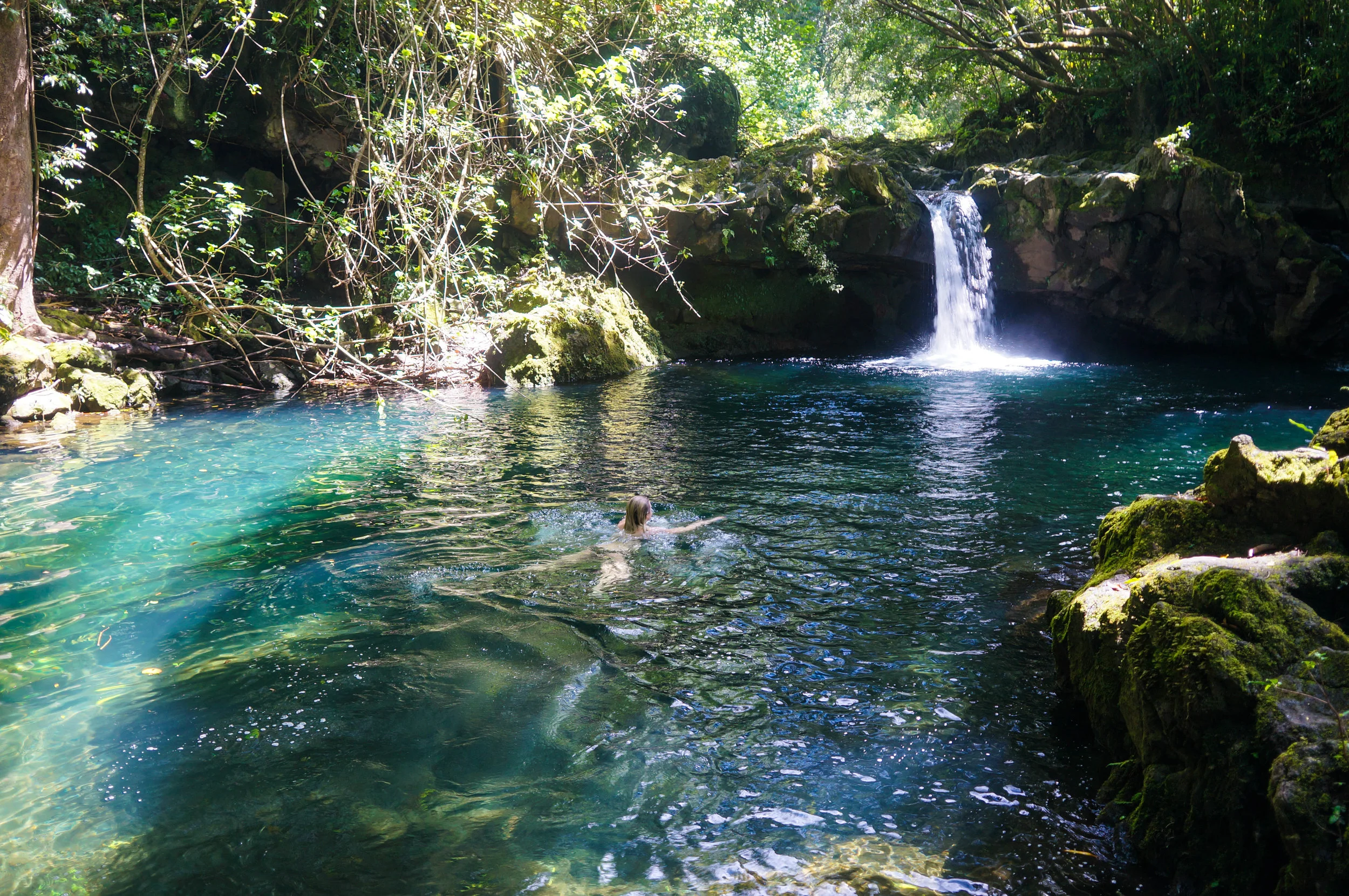 After you park, walk past the church, across a bridge and continue down the path to the water. On your right, about 200 yards before the ocean, you’ll be able to spot a swimming hole with a waterfall. There’s a short path to climb down to the water, which can be pretty steep, but it’s manageable if you go slow. We love swimming here and going behind the waterfall! We’ve been lucky enough to have this place to ourselves several times.